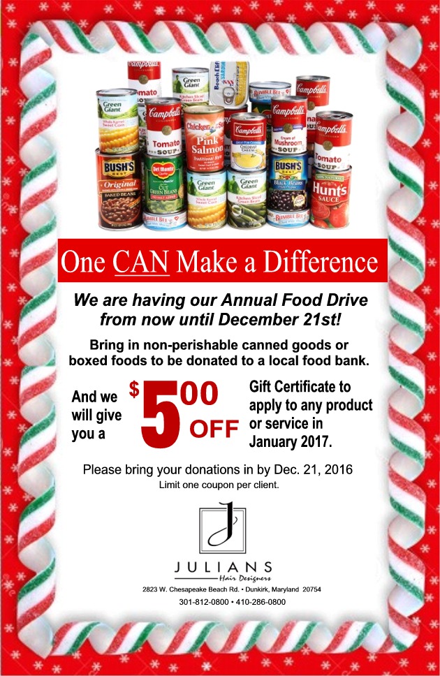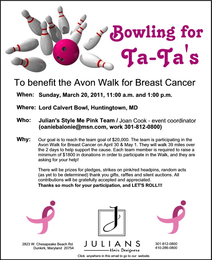 Still time to donate to our Annual Food Drive! December 16, 2016 Bowling for Ta Tas March 16, 2011 Julians stylist, Marie Tippett, has been mailing hair donations to the Wigs for Kids program… March 16, 2011 Walk for breast cancer 2010 July 16, 2010 Load more